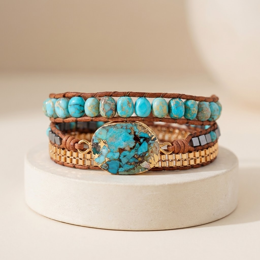 Turquoise Hand-Woven Multilayer Leather Wrap Bracelet Natural Stones Handmade Bracelet